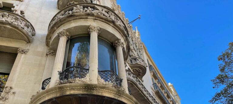 Built between 1902 and 1906, Casa Lleó Morera is a residential building located on the Passeig de Gràcia in the Eixample district, site of many of Barcelona’s most impressive examples of modernist architecture. Most visitors rush past the Casa Lleó Morera on their way to admire the nearby Gaudí masterpieces Casa Batlló and La Pedrera, but it’s well worth pausing at the corner of Carrer del Consell de Cent to take a look at the ornate facade of the building Montaner designed for Francesca Morera.