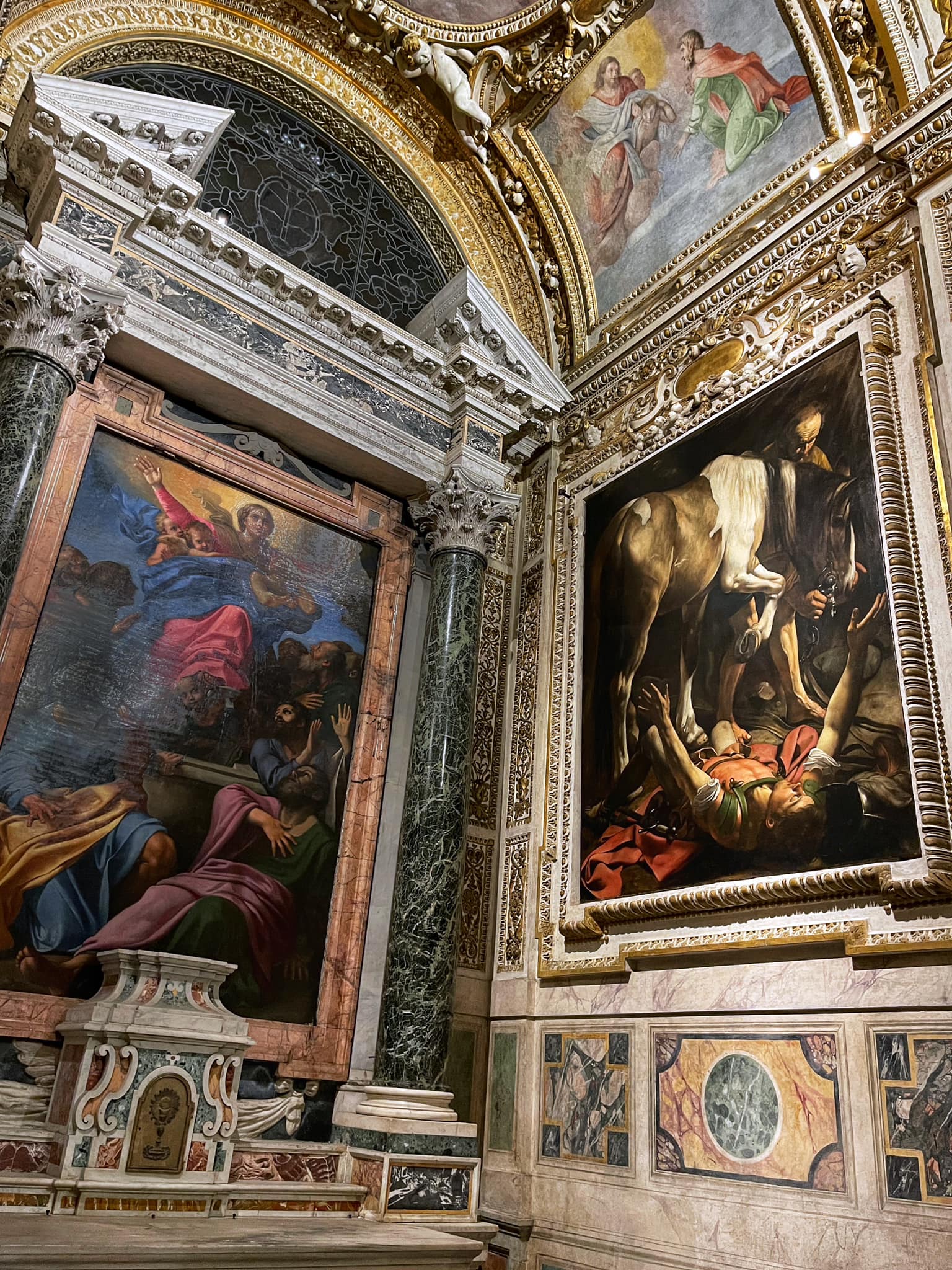 The ancient church of Santa Maria del Popolo hides two of Caravaggio’s greatest masterpieces, The Conversion of Paul and The Crucifixion of St. Peter. In these stark expressions of Caravaggio’s unique brilliance, guileless figures loom out of the darkness at us, disconcertingly close and unexpectedly large. These are no idealized exemplars of classical beauty, but men with dirty feet and faces marked by their wearisome work. In The Conversion of Paul, Caravaggio turns centuries of conventional wisdom concerning composition and symmetry upside down – his canvas is dominated not by the moment of divine revelation but instead by the huge and inelegant flank of a draft horse. The contrast with the classical serenity of Annibale Carracci’s altarpiece could hardly be more obvious, as two visions of the future of art vie for the ascendancy in the space of this tiny chapel. It was the vision of Caravaggio that would win the day. These rough and unadorned canvasses of real people thrust into the world of biblical narrative constituted nothing less than a revolution in religious art, and painting would never be the same again.