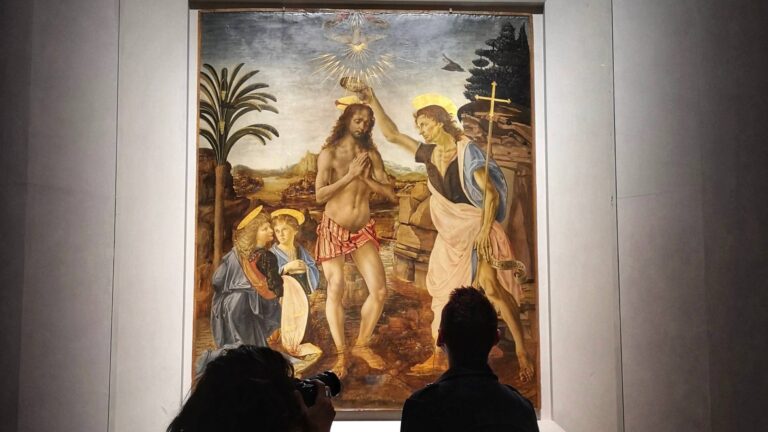 Depicting the pivotal moment of Christ’s baptism at the hands of a gaunt looking at John the Baptist in the river Jordan, Andrea del Verocchio’s masterful Baptism of Christ was painted in the 1470s to a commission from the monks of the church of San Salvi. Surviving various vicissitudes over the centuries – including the razing of San Salvi during the 1529 Siege of Florence and the transformation of its new monastic home of Santa Verdiana into a slaughterhouse under the auspices of Napoleon – the painting was finally transferred to the safety of the Uffizi Gallery in 1919.