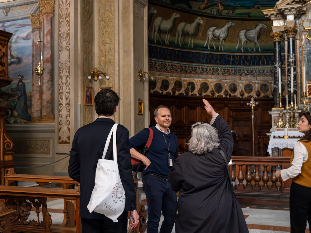At the center, Christ descends to earth in a kaleidoscope of vibrant color, while saints and prelates are busy in conversation all around him. Pope Felix himself, meanwhile, humbly presents a model of the church for Christ’s approval. On our tour, we’ll learn about the mosaic’s fascinating and complex iconography, featuring a series of beautifully portrayed sheep, a phoenix, and even palm trees.