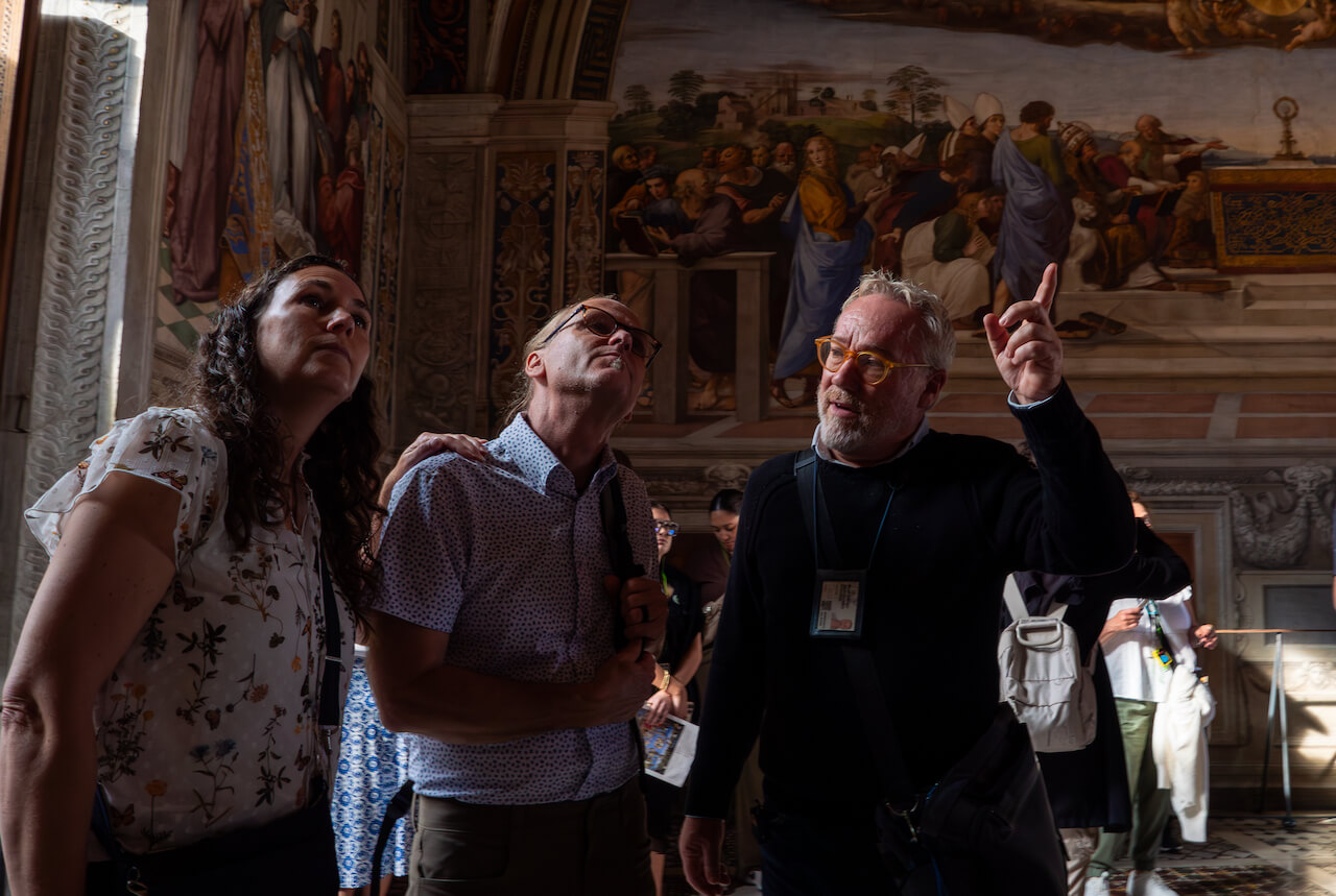 This was a period of overwhelming enthusiasm and of amazing innovation. The men of the Renaissance didn’t merely dream of changing the world – they really revolutionised it. The printing press, the geographic maps with which Columbus reached the Americas, modern science, architecture, art and the sense of beauty (a concept demonized in the Middle Ages), all these were their creations. The frescoes of the Raphael rooms perfectly depict the world of the contemporary courts that governed the course of this new world and where the great geniuses of the age called home. The cultured conversations fueled by the wine of sumptuous banquets, the statues brought to light by a frenzied passion for excavations, new fashions, and above all new ways of thinking and living, are marvellously recreated by Raphael with the perfect touch of his graceful brush. This is an experience that we will have the opportunity to relive in the flesh on our private Vatican tours. There is an entire world to discover here, a world of which we ourselves are the children.