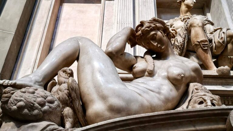 In San Lorenzo’s New Sacristy nearby Michelangelo would take on the enormous task of constructing the Medici family’s mausoleum, a space that had to reflect the vast ambition of the city’s most powerful dynasty. Commissioned by Cardinal Giulio de Medici (future Pope Clement VII) in 1520, Michelangelo designed every aspect of the sacristy. The complex iconography that underpins the tombs of the Medici Dukes Lorenzo and Giuliano as well as the complementary statues representing Day and Night reflect the sophisticated philosophical environment cultivated by the Medici as well as Michelangelo’s own Neoplatonic spirituality.
