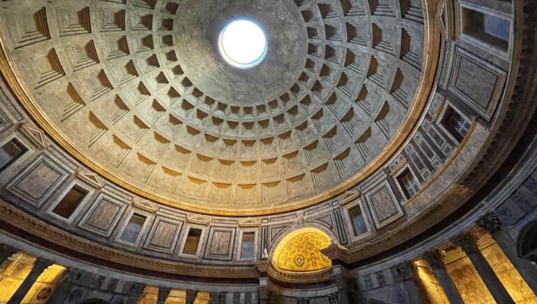 Weighing in at a mind-boggling 4,535-tonnes, it demonstrates the advanced skill and confidence of ancient Roman engineering better than any other structure. The dome forms a perfect hemisphere – its diameter and height are the same – helping to create an harmonious and balanced interior space that embodies the Romans’ sophisticated understanding of geometry.