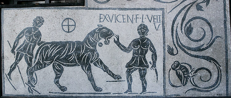 We have a great idea of how the hunting spectacles progressed during Roman games because they are depicted in countless surviving mosaics and frescoes from all across the empire. One of the most interesting is the so-called Magerius mosaic, commissioned to commemorate the eponymous Magerius’ generous sponsorship of a games in Tunisia. Lightly dressed venatores, whose names are commemorated in inscriptions, expertly dispatch leopards (also named) with spears – one even does so on stilts – as an attendant proffers bags of cash for each animal killed.