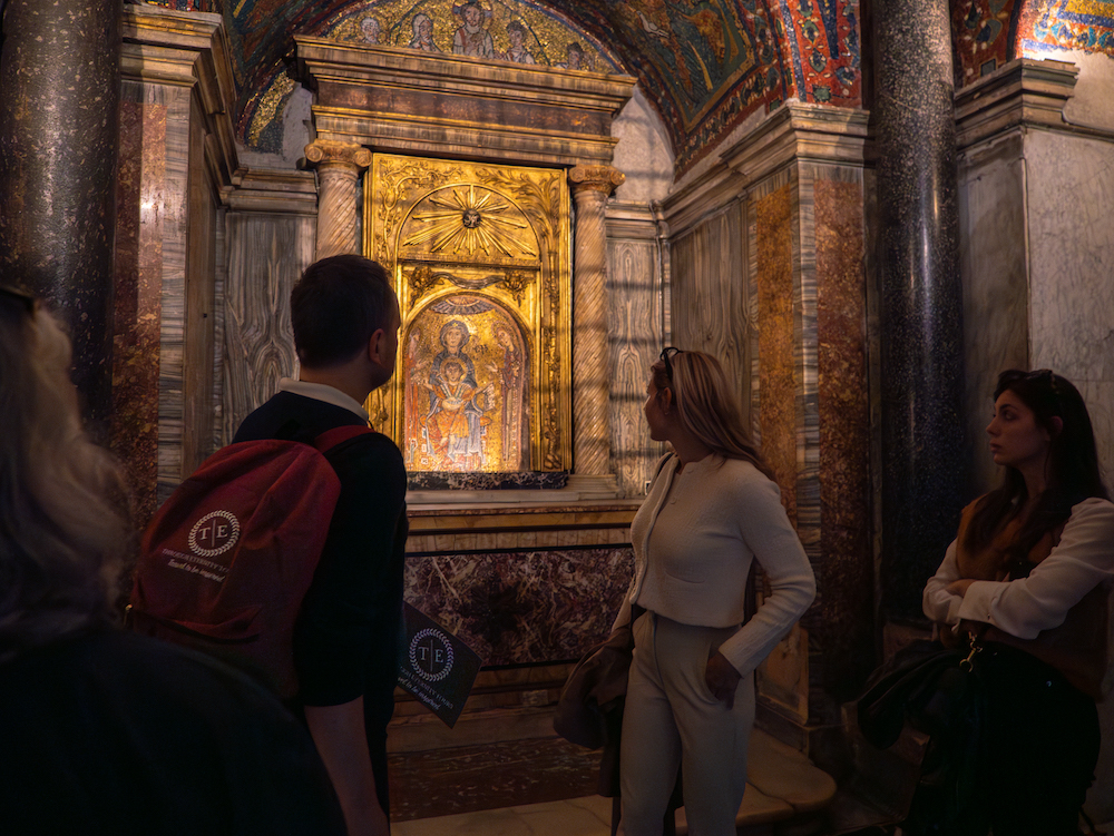 On our tour, we’ll also get to take a look at the stunning chapel of San Zeno, one of the greatest artistic hidden gems in all of Rome. Here, jaw-dropping golden mosaics portray Christ being carried aloft by four angels alongside scenes from the Bible and the lives of the Saints. The amazing chapel was commissioned as the final resting place for Paschal’s mother, Theodora, who you can spy in one of the mosaics – her square nimbus halo indicates that she was still alive when the mosaics were completed.