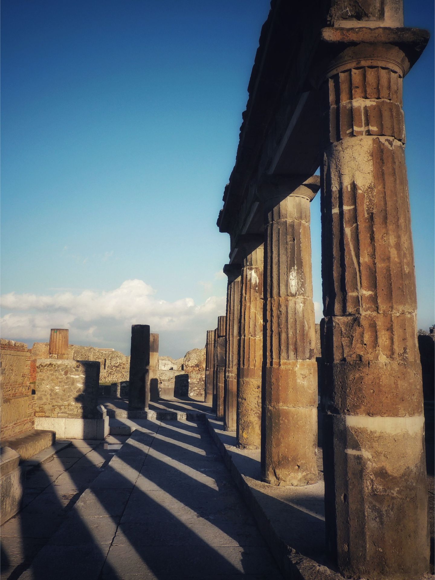 It is late morning on August 24th in the year 79AD. A dense black cloud rises from Mount Vesuvius, taking the form of an enormous pine tree. It grows larger by the minute and within a few hours it completely covers the sky. Burning rocks rain down on the city. The Earth trembles and though it is broad daylight, night falls on Pompeii and its surroundings. The most deadly and disastrous phase of the eruption will occur a short time later, at sunrise on August 25th. The sea withdraws and explosions of molten ash and steam burst from the mountain, advancing at hurricane speed, burying trees, people, and everything in its path. The people of Pompeii are terrified and try to flee the city, protecting themselves with pillows and blankets from the falling rocks.