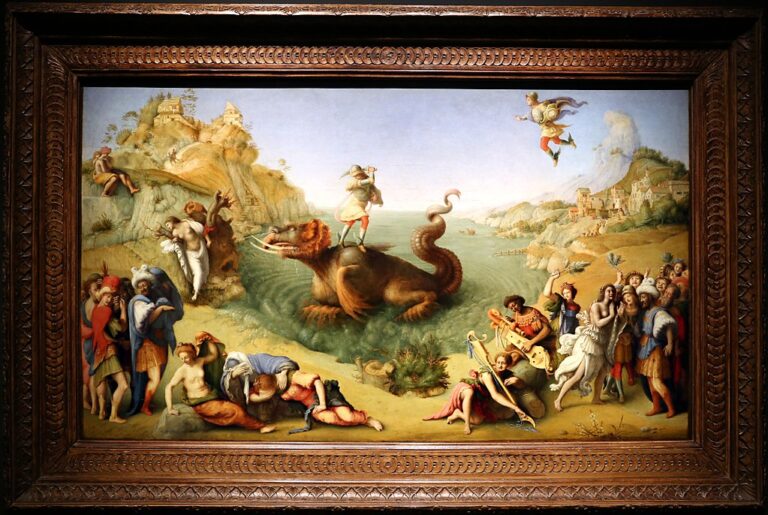 Piero never made a more lovely or more highly finished picture than this one, seeing that it is not possible to find a more bizarre or more fantastic sea-monster than that which Piero imagined and painted, or a fiercer attitude than that of Perseus, who is raising his sword in the air to smite the beast. In it, trembling between fear and hope, Andromeda is seen bound, most beautiful in countenance ; and in the foreground are many people in various strange costumes, playing instruments and singing; among whom are some heads, smiling and rejoicing at seeing the deliverance of Andromeda, that are divine. The landscape is very beautiful, and the coloring sweet and full of grace. In short, with regard to the harmony and gradation of the colors, he executed this work with the greatest possible diligence.