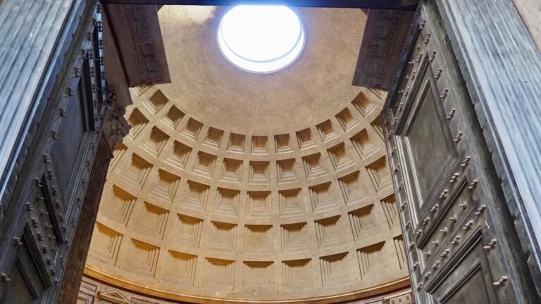 Right at the top of the Pantheon’s dome is perhaps the building’s most iconic feature: this is the oculus, a circular opening in the roof that allows natural light to enter the building in great dramatic shafts of sunlight. Like the coffering of the dome, the oculus was another ingenious way for the Roman engineers to lighten the massive load of the edifice, ensuring its structural stability.
